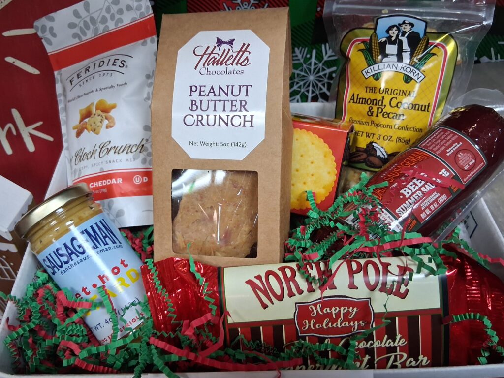 Halletts Peanut Butter Crunch, Dan the Sausageman Summer Sausage, Snack Crackers, Candy Cane Candy Bar, Sweet Hot Mustard, Killian Korn, 5 O’clock Crunch. $47 – $67 w/shp