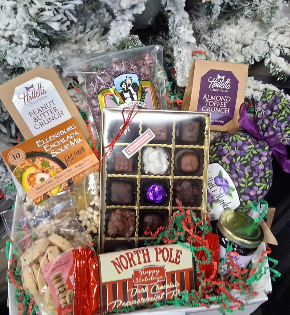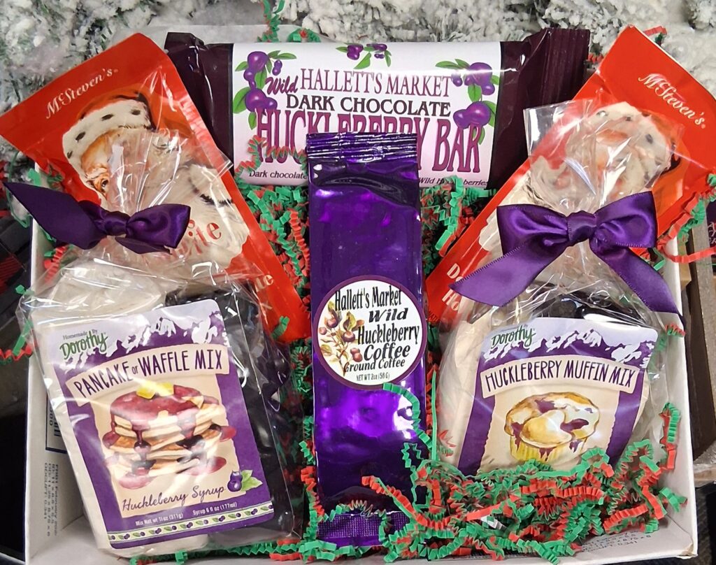 Halletts Almond Toffee Crunch, Halletts Peanut Butter Crunch, Northwest Soup (family size), Killian Korn Huckleberry Jam, Candy Cane Chocolate Bar, Shortbread Cookies, Huckleberry Muffin mix, Halletts 15-piece Chocolates $89 out the door or we ship it – $109 w/shp